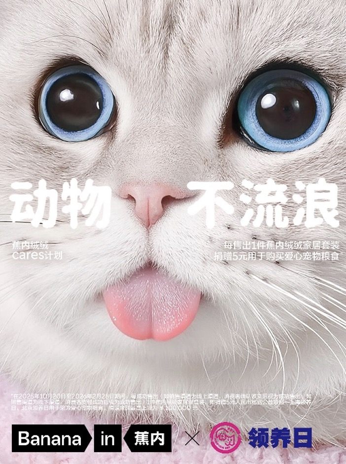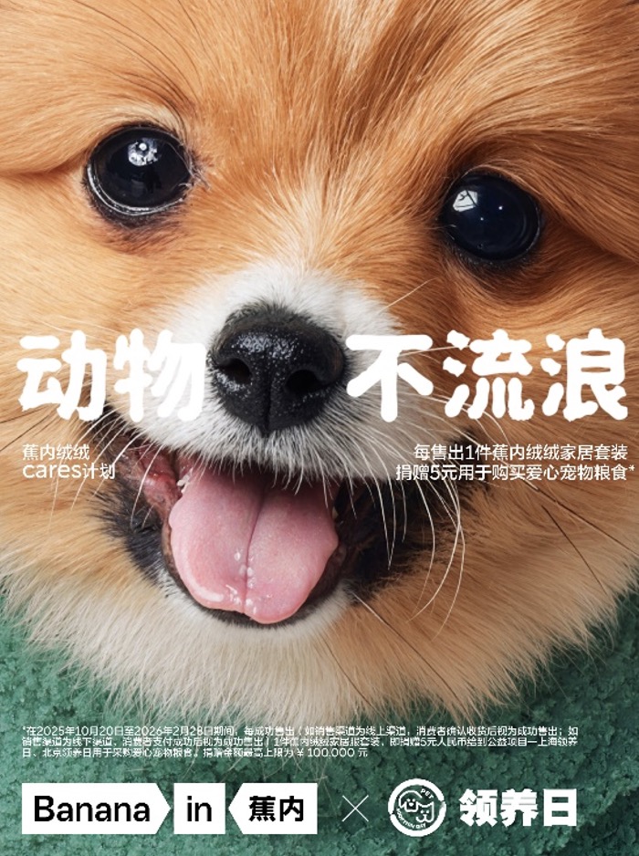 基于”体感科学”的核心理念,蕉内更将舒适的定义,从人的身体感受延伸至更广阔的生命关怀。品牌携手公益组织”领养日”大力开展「蕉内绒绒cares计划」,聚焦已被领养流浪动物的真实生活状况,通过实际行动为它们提供持续关怀,让每一个生命都能获得应有的温暖与安宁。