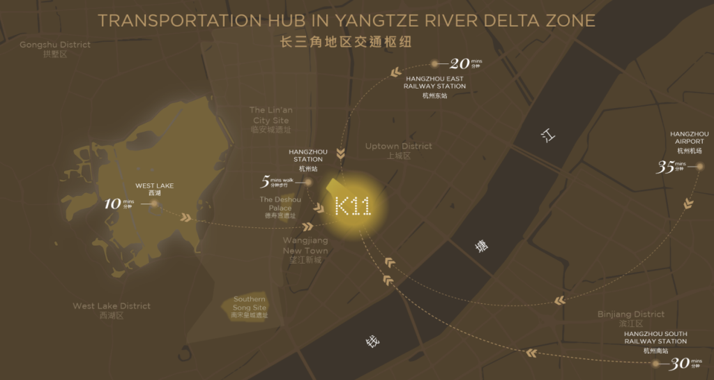 依托高铁杭州站与地铁枢纽的双重优势,项目可快速连通长三角主要城市,融入“一小时经济生活圈”,凸显望江新城的门户地位。同时,望江新城片区及周边高端住宅密集,聚集了高比例的高净值人群,潜在客群消费层级较高,对艺术、美食、设计及高品质零售保持持续关注与消费热情,将为杭州K11的商业发展与文化运营提供稳固支撑。